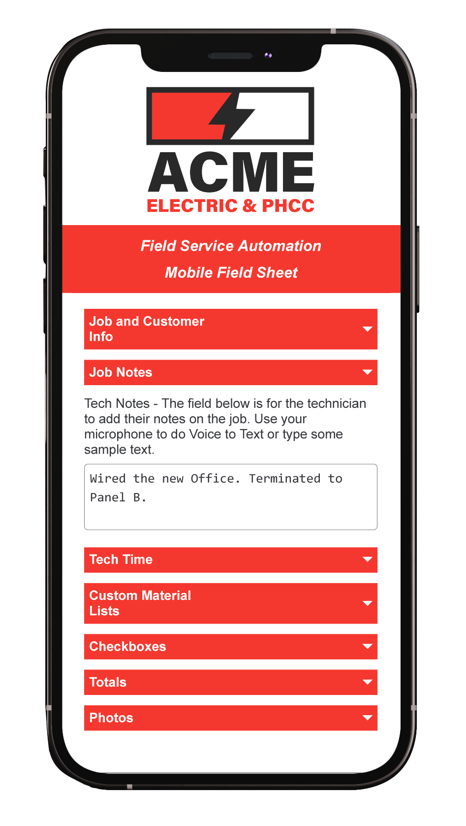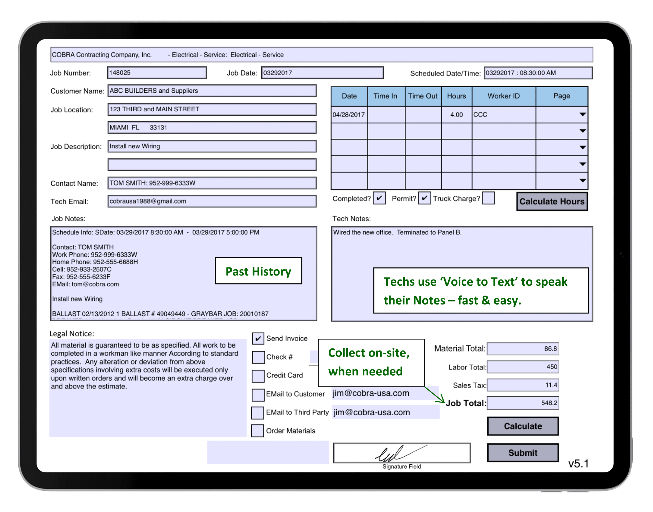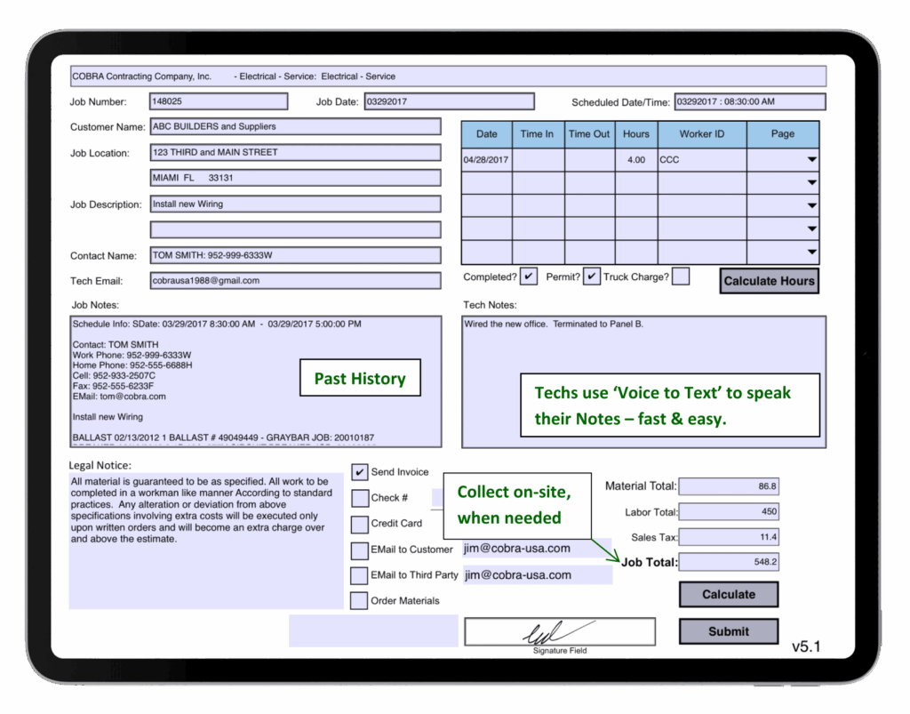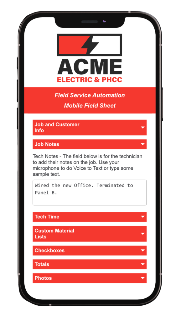 Custom material list ensures field techs track all materials used.